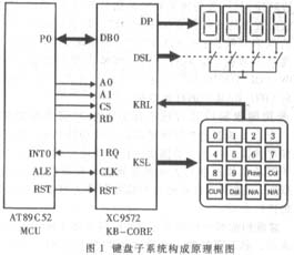 图1是单片机系统中键盘子系统的构成原理框图。其中键盘接口芯片KB-CORE是该子系统的核心部分,它应具备如下功能:第一,产生按键扫描时序,并进行硬件去抖动。如果有按键按下,实现按键编码、中断处理等功能。第二,可以区分处理数字键和功能键。数字键将由接口芯片暂存,而当功能键被按下时申请CPU中断处理;对多个按键同时按下,按一定的编码优先级处理。第三,提供与MCS-51系列单片机兼容的接口,单片机可以读取芯片中保存的数据或功能代码。第四,提供数据显示接口,可以直接驱动4位七段LED数码管,并进行动态扫描显示。